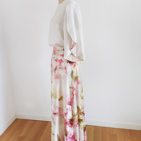 Un abito pensato, discusso e...Sbocciato, come sbocciati sono i fiori del pregiato tessuto in seta satin (Valli) della gonna, ripresi nella parte interna delle maniche. La casacchina sblusata e', in realtà', un body (sopra in seta, sotto in jersey di cotone leggermente elasticizzato) con la particolarità' delle maniche 'a petalo'. Il tutto e' completato da una stola double in cachemire (bianco/rosa antico). Viva gli sposi!!!